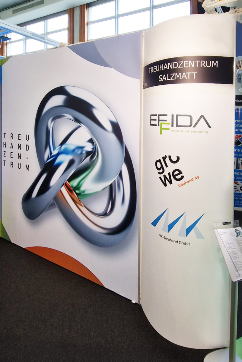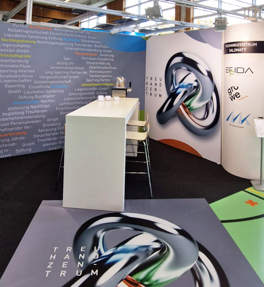 Für das Treuhandzentrum Salzmatt haben wir ein modernes und aufmerksamkeitsstarkes Messestand-Design umgesetzt, das die Kompetenz und Professionalität des Unternehmens visuell unterstreicht. Ziel war es, einen klar strukturierten und gleichzeitig einladenden Auftritt zu schaffen, der Vertrauen vermittelt und Interessierte direkt anspricht.