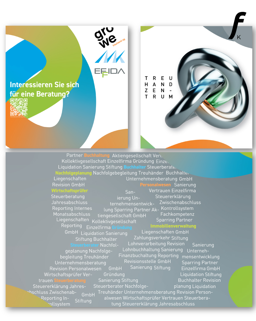 Grossflächige Textflächen mit Schlagworten aus dem Treuhandbereich verdeutlichen die vielfältigen Dienstleistungen – von Buchhaltung über Steuerberatung bis hin zur Unternehmensentwicklung. Dadurch wird der thematische Fokus für Besucher*innen sofort erkennbar.