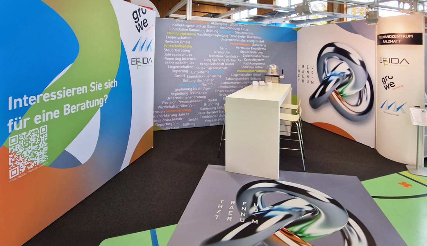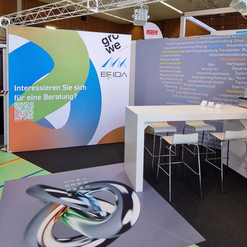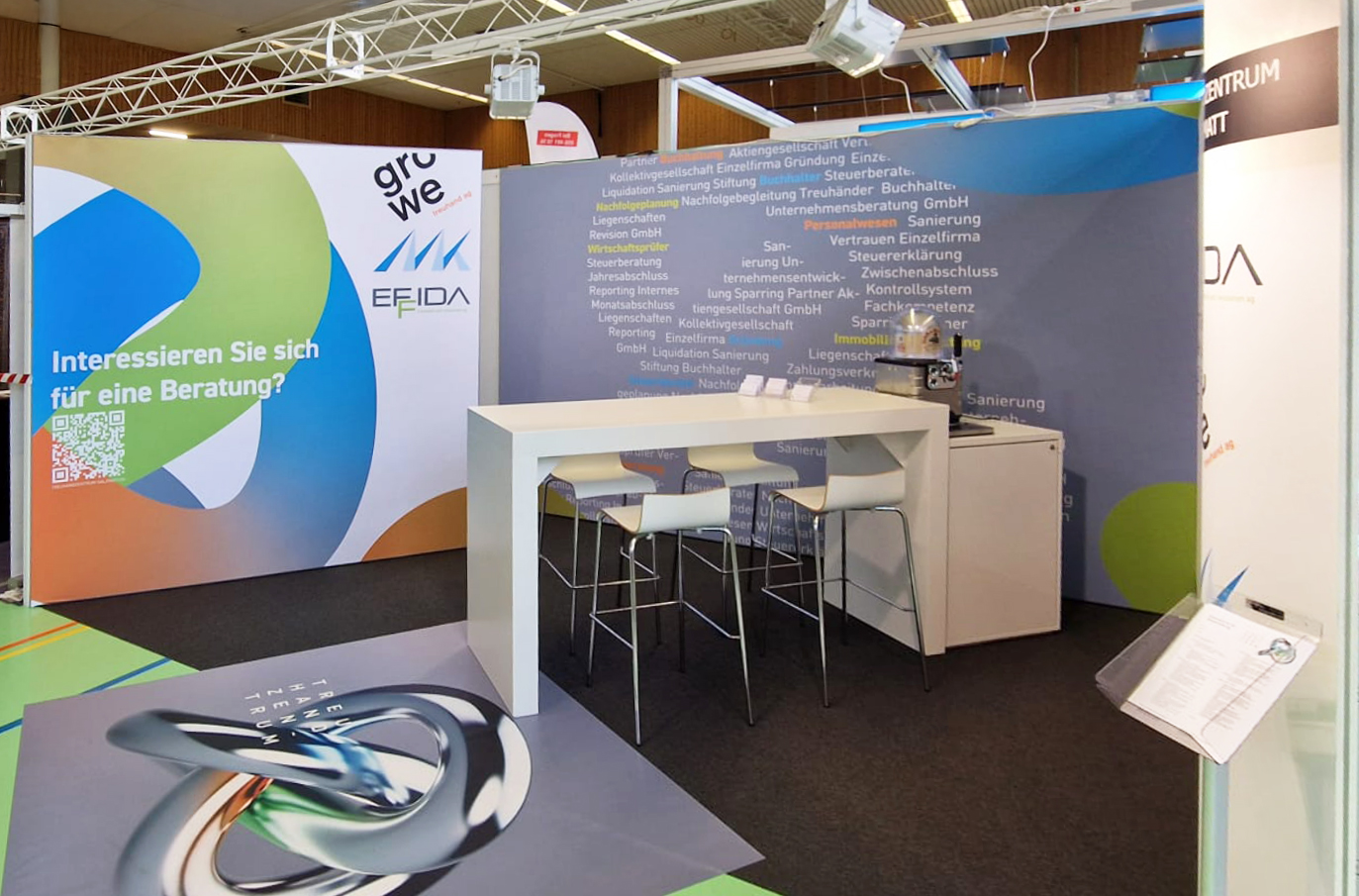 Die drei Logos sind prominent und wiedererkennbar platziert. In Kombination mit der reduzierten Typografie und der modernen Formsprache entsteht ein Stand, der Seriosität, Kompetenz und Nähe vermittelt. Ein Messestand, der mit Klarheit und moderner Gestaltung überzeugt, die Werte des Unternehmens transportiert und Interessenten effektiv anspricht.