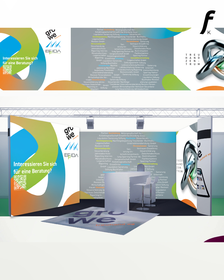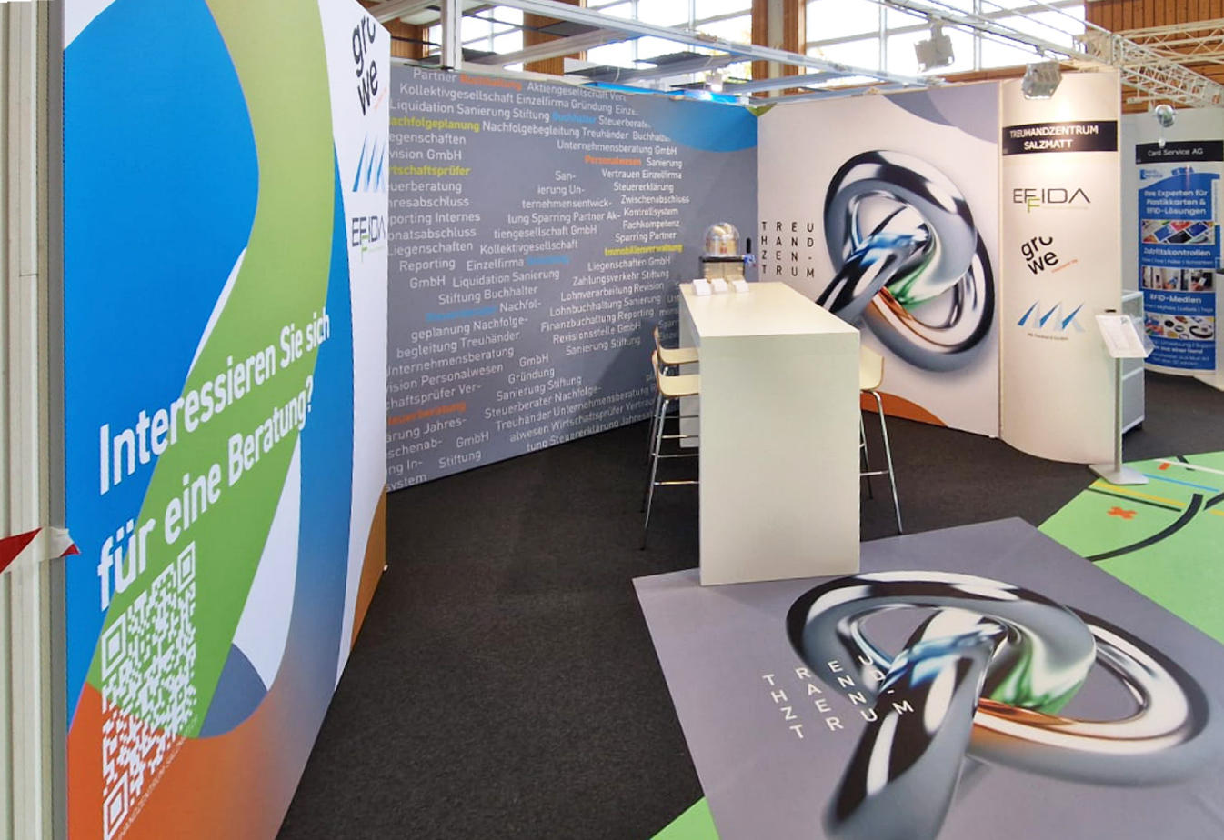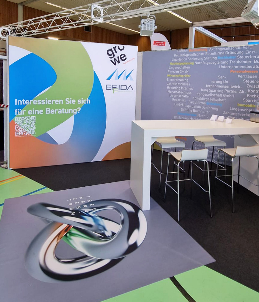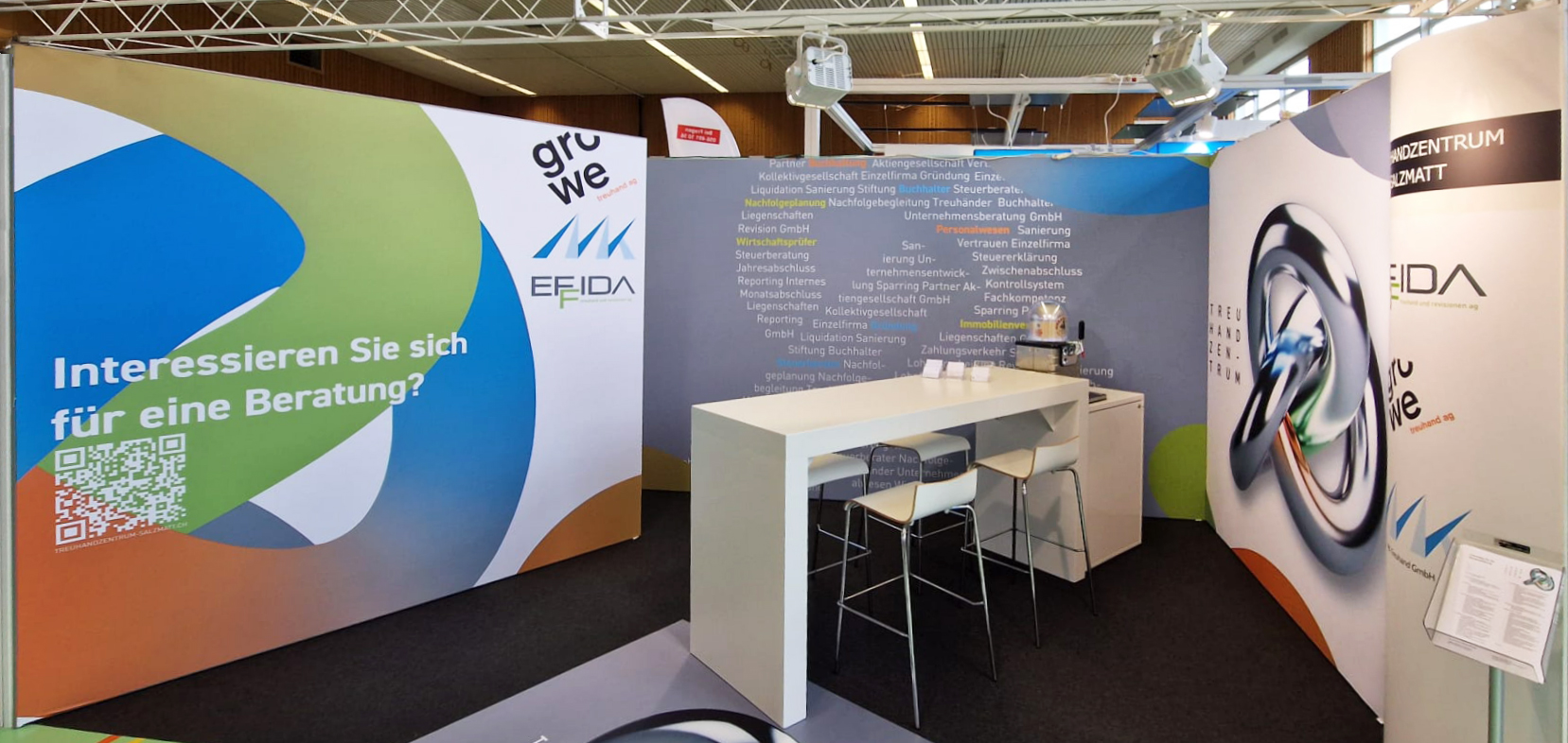 Die drei Logos sind prominent und wiedererkennbar platziert. In Kombination mit der reduzierten Typografie und der modernen Formsprache entsteht ein Stand, der Seriosität, Kompetenz und Nähe vermittelt. Ein Messestand, der mit Klarheit und moderner Gestaltung überzeugt, die Werte des Unternehmens transportiert und Interessenten effektiv anspricht.